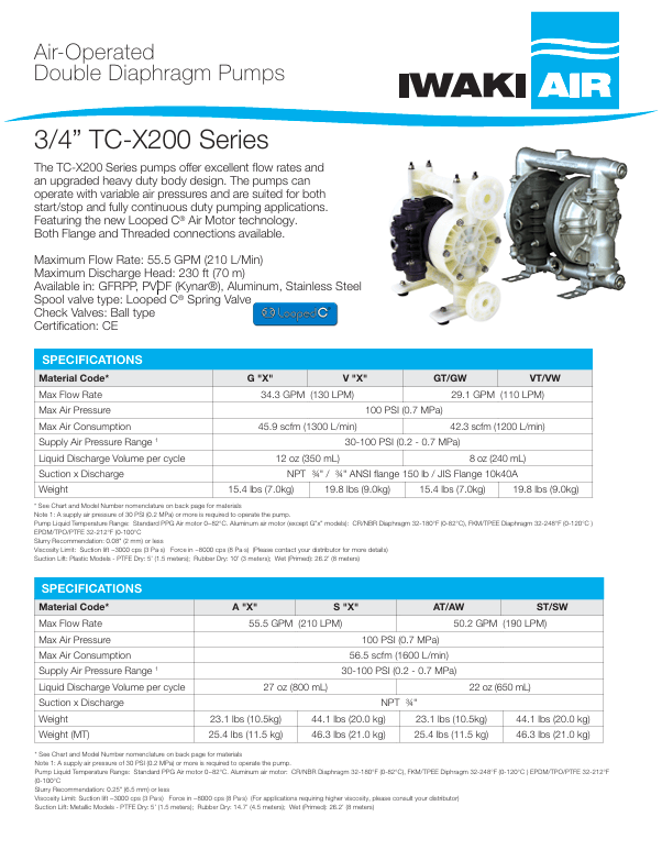 TC-X200-Series 3/4″ pumps are available in Aluminum and Stainless Steel with optional Aluminum air motor section for exceptional chemical resistance. Featuring the new Looped C® Air Motor technology. Threaded connections available.