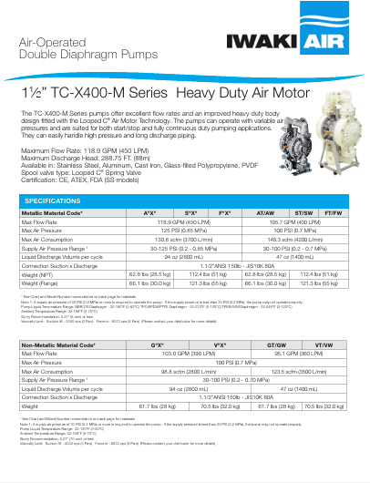 The TC-X400-M Series pumps offer excellent flow rates and an improved heavy·duty body design fitted with the Looped C® Air Motor Technology. The pumps can operate with variable air pressures and are suited for both start/stop and fully continuous duty pumping applications. They can easily handle high pressure and long discharge piping.